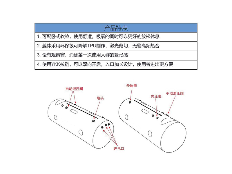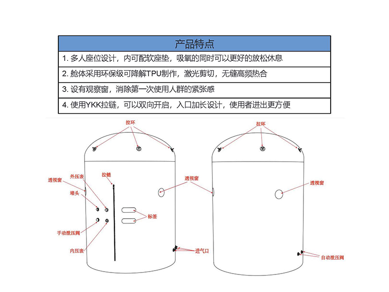 艙體密封:艙口使用雙層高強(qiáng)度密封拉鏈,增加艙體的承壓強(qiáng)度,減少拉鏈處氣體的泄露率。